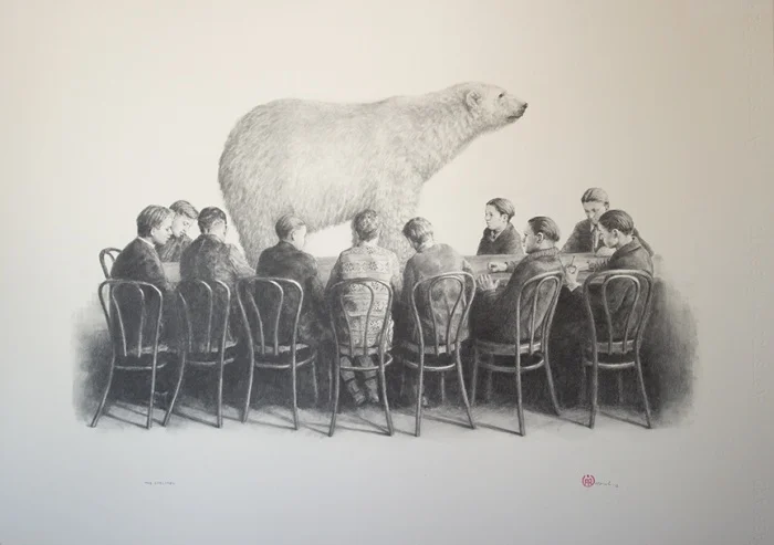 For “The Land of Id” colour is a means of focusing the viewer on the results of the consumerist culture. The blue of the water in the ice-cutters painting takes you past the group of men working, past the pristine landscape right to the consequences of the Arctic as resource. From such a simple gesture Hamel can introduce so much into the conversation around what are we collectively doing to the Earth. As one is drawn deeper into the work more questions are revealed. Layered over it all theres the curiosity about the act of ice cutting itself, the history of the trade. That alls in just one piece of hers. Therein lays the complexity Hamel sees and her brilliance is in how she gathers it all into an initial layer that is friendly, funny, accessible and familiar. She may be painting but she draws you in.