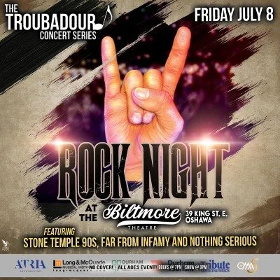 Gigs This Week: Rock Night Troubadour Series at the Biltmore Will McGuirk July 4, 2022 By Will McGuirkStone Temple 90s, Far From Infamy, Nothing Serious at the Biltmore Theatre Saturday July 8, 2022. Free Show.
