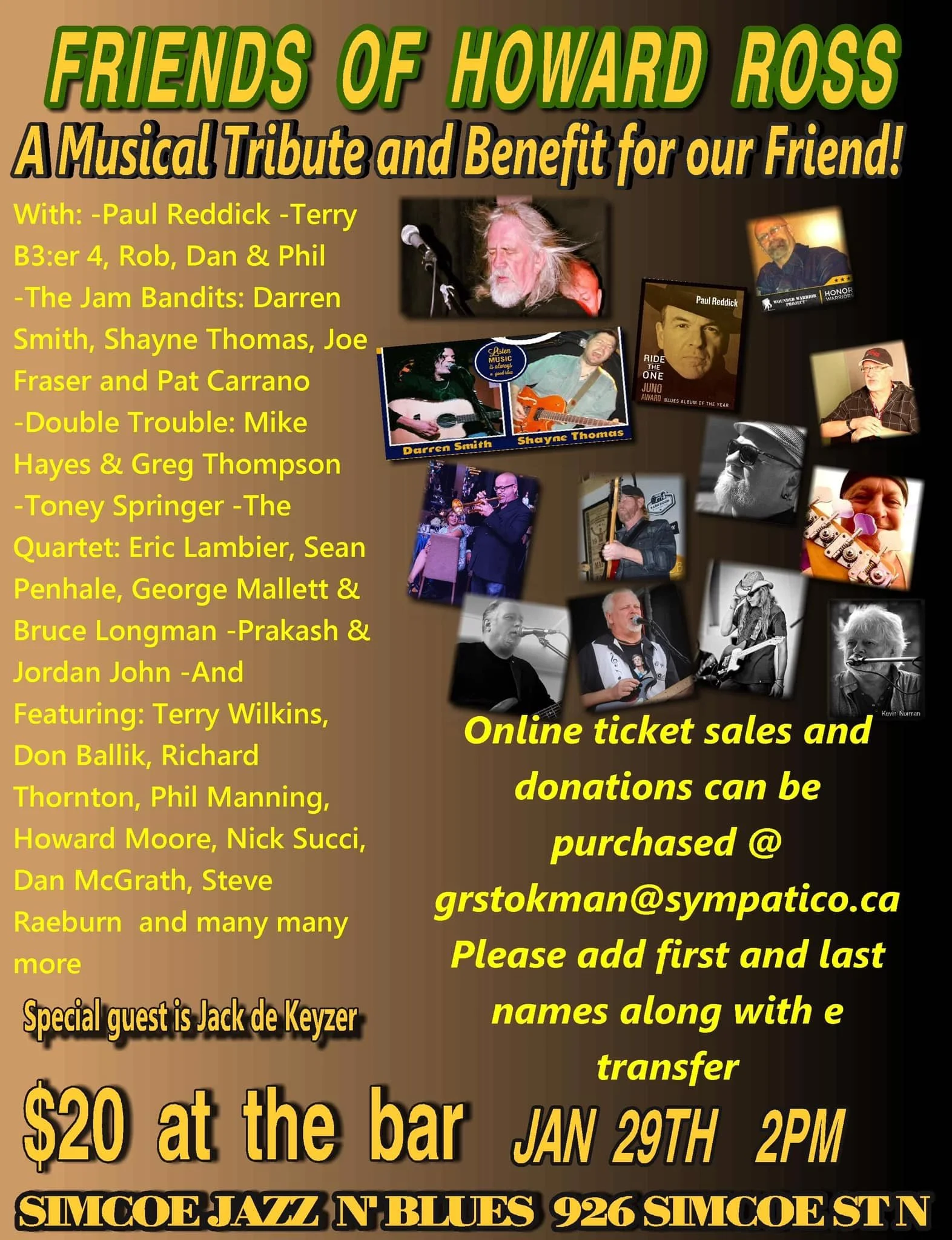 A tribute and benefit for local legend Howard Ross who is in failing health. Performers include Jack De Keyzer, Paul Reddick, Eric Lambier, Darren Smith, Toney Springer, and many more. The show starts at 2 p.m.