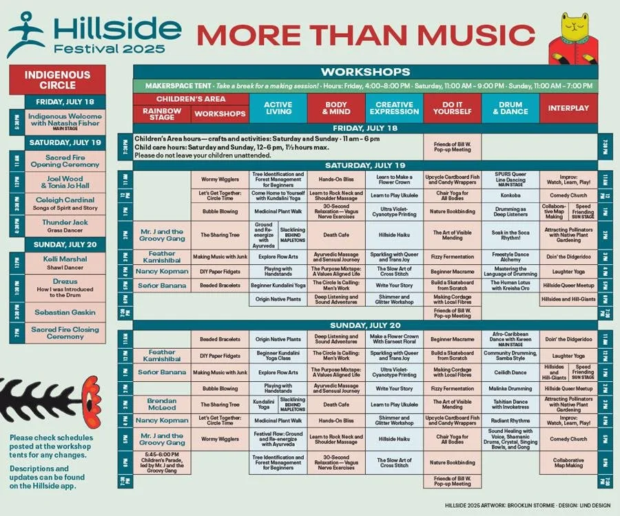 Ok time to start planning your Hillside experience. There are always so many acts one wants to witness but obv one can only be at one stage at a time. But over three days there will be ample opportunities to catch acts a few times as there are workshops and collaborations scattered across the weekend. Hillside organisers are also pros at this, they’ve been doing it over four decades so conflicts are kept to a minimum and set times are staggered to ensure one can get the beginning of one artist and the end of another if thats how one might roll. Plus its a very accessible walkable island so that is a real possibility.
