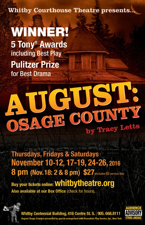 August: Osage County continues at the Whitby Centennial Building November 17-19 and November 24-26, 2016. Curtain is 8 pm. There is one matinee performance at 2 pm on Saturday, November 19, 2016. Tickets may be purchased at the door or on line. For further information, please visit the website or call 905-668-8111.