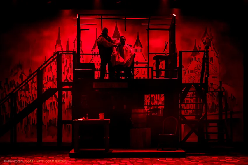 As SWEENEY is a three-hour production with intermission, the pacing and staging are of utmost importance to director David Silvestri and, for the most part, the cast works diligently to maintain the momentum in propelling the story forward. Some of those set pieces look extremely hard to manoeuver and, as performances continue, I’m sure all the marks will be hit quickly and safely. There are some outstanding moments that need to be highlighted. As the simpleton Tobias, Sheldon Suepaul tugs at our hearts as he sings “Not While I’m Around” to Mrs. Lovett. I wondered how the murders would have been committed once the infamous barber’s chair was revealed – with the use of lights, each one is chilling to watch. As lovebirds Johanna and Anthony, Taylor Rodkin and Jason Butler Burns convincingly juxtapose that goodness can and tries to exist in the dark underbelly of London. Alison Braley-Rattai’s Beggar Woman captures beautifully the life of the poor and just that final element of sadness that sends Todd over the edge. Jeremy Cook as Beadle continually senses how following the law is of utmost importance even though the world around him is crumbling. Johnny Soln offers much needed laughter as the shyster, Pirelli, before the carnage begins.