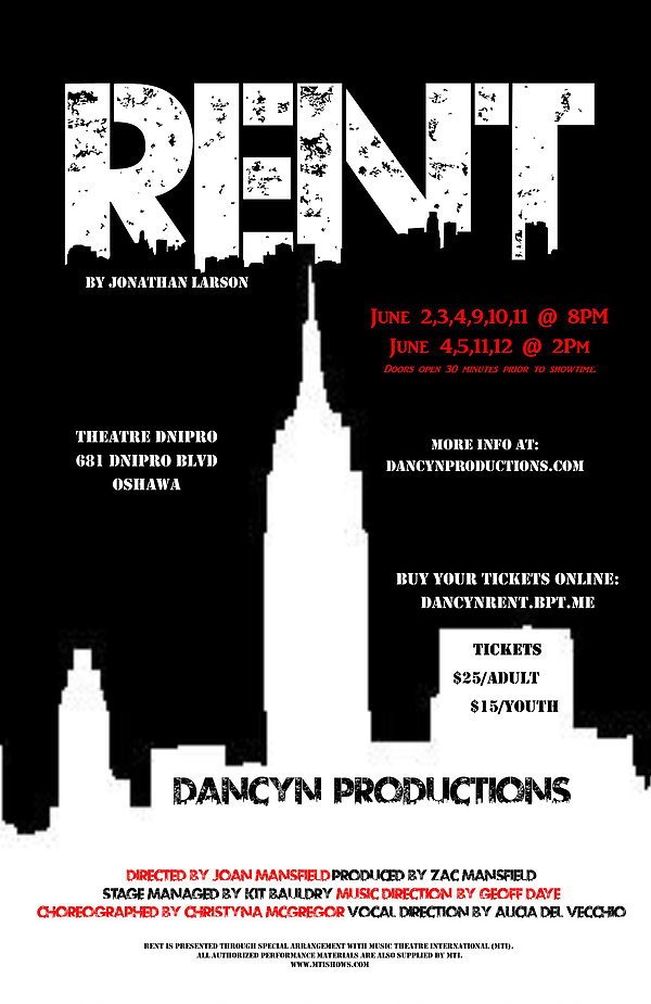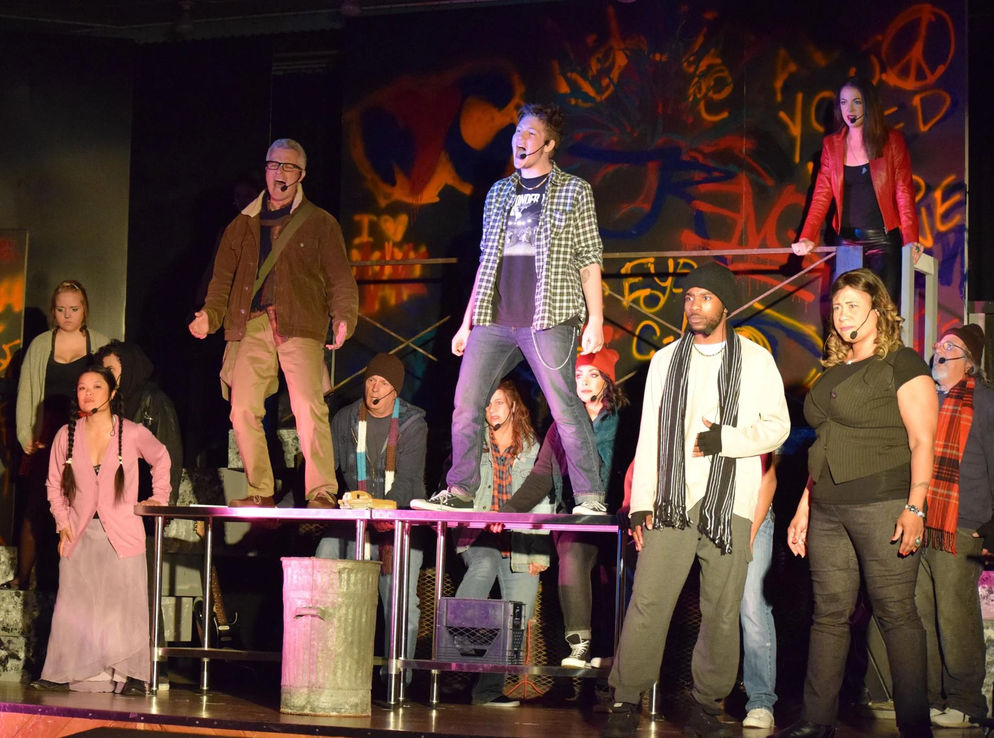 ‘Rent’ is one of those iconic musicals that will probably never become dated as its’ messages of acceptance, love, redemption and hope are universal and timeless. It is one hell of a show even to consider staging on so many theatrical levels. Once again, Dancyn Productions is to be commended for tackling ‘Rent’ for a number of reasons. First, Mrs. Mansfield holds true to her company’s mandate in casting new actors for each production. It was inspiring to see so many new faces with ages ranging from 15 – 60 on the Dnipro Hall stage. Some of the cast has driven in from Peterborough and Brampton because they wanted to be a part of this ‘rock’ experience and I, for one, certainly hope they will return for other productions in the Durham Region in the future.