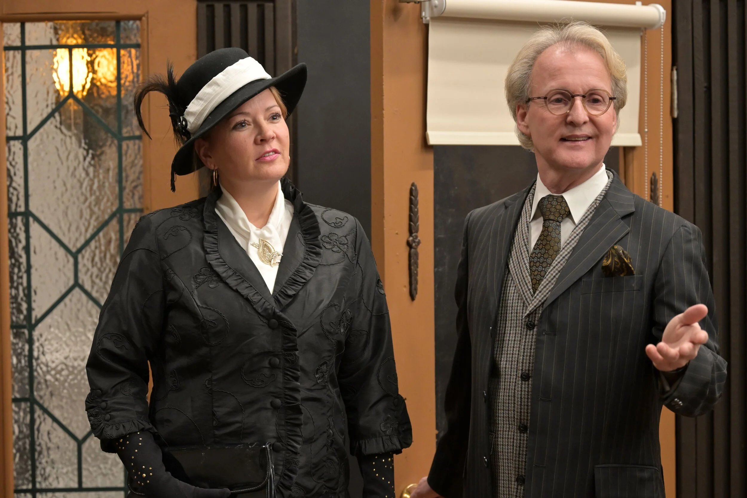 Mr. Rajotte’s set is, in a word, breathtaking. From the moment you walk into the Fairview Library Theatre, the Davenport’s Gentlemen’s Clothing store immediately draws you in with its opulent beauty — warm wood finishes, luxurious fabrics, pops of colour, and ornate detailing everywhere. From the quaint hand-drawn shade over the door stage right to the cozy wingback chairs stage left, no detail is missed. Not only does the set serve its purpose of being a men’s clothing store but it is dressed with such painstaking detail that it is the embodiment of Norman’s stylish, old-world sensibilities. Even the symmetry of the store’s display area mirrors Norman’s traditional sense of style. The costumes, which were also designed by Mr. Rajotte (is there anything this man can’t do?), matched the characters’ personalities nicely.